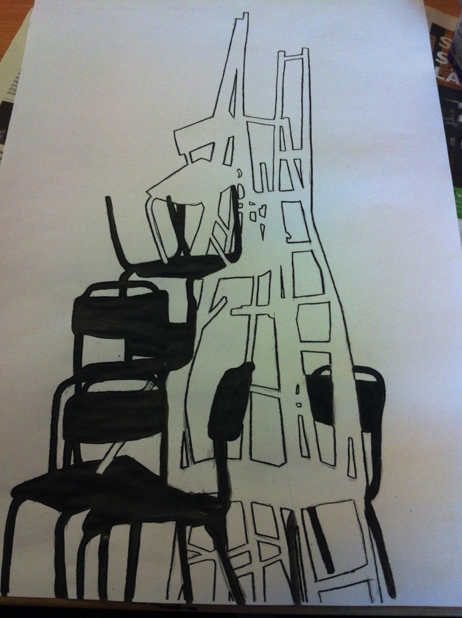 dagens uppgift i skolan var att rita av mellanrums-formerna i den där högen av stolar och saker. Sedan kopierade jag det och gjorde tre olika varianter av det till.